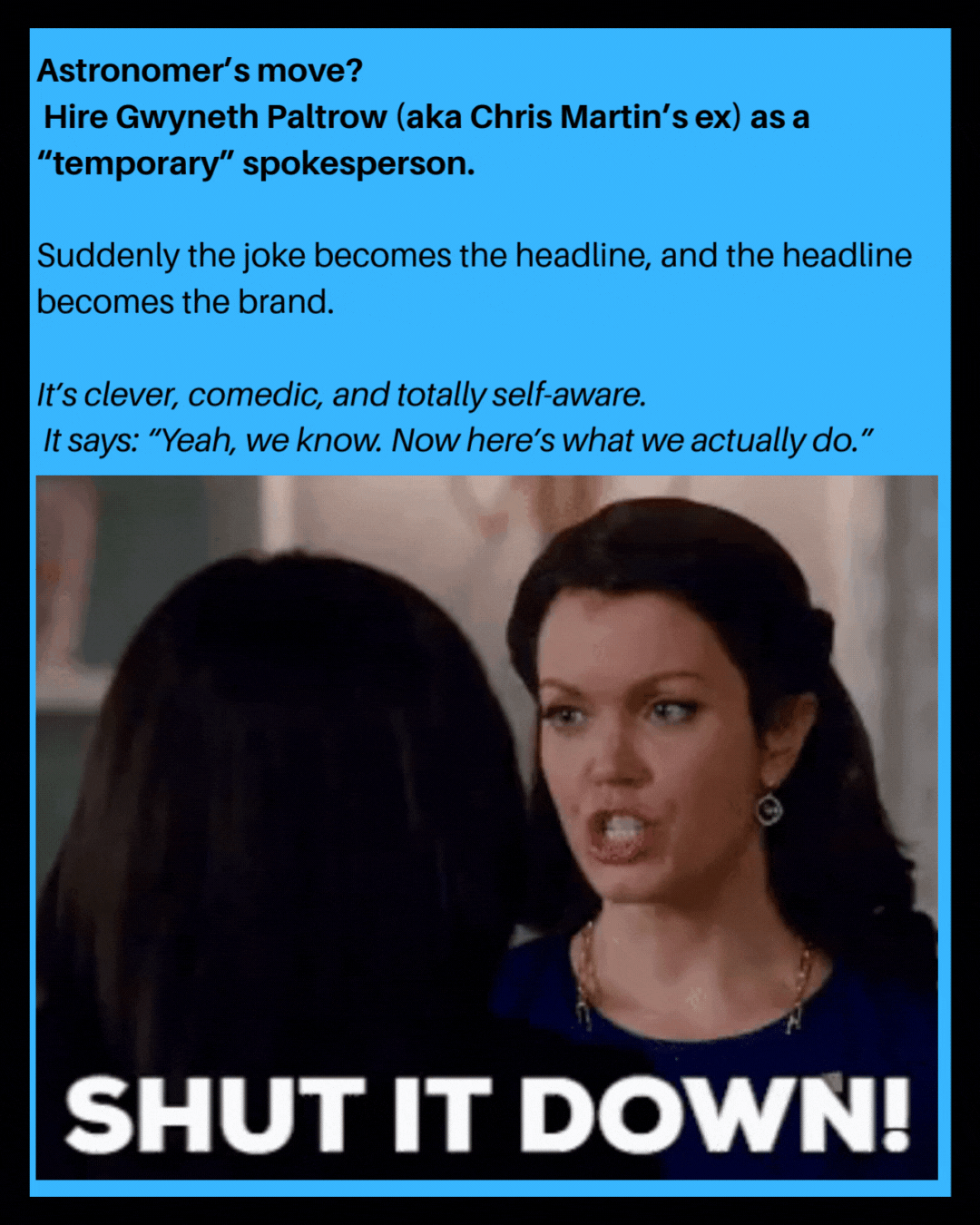 astronomer leaned into that reality. instead of pretending the drama wasn’t happening, they acknowledged it and gave it a twist. the strategy wasn’t about sweeping things under the rug — it was about putting the rug on the runway and letting gwyneth walk it.